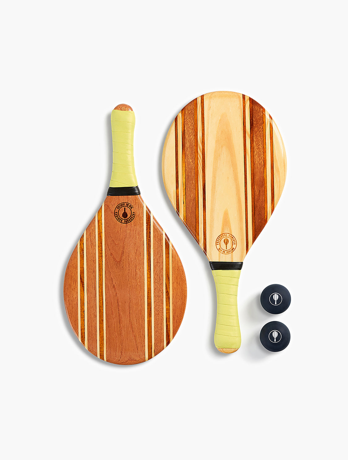 Hand-carved by Brazilian marceneiros from sustainably sourced wood offcuts, each frescobol bat is one-of-a-kind. Finished with a sea and sand-resistant resin, our eponymous beach bat fuses practical playful charm with refined craftsmanship.