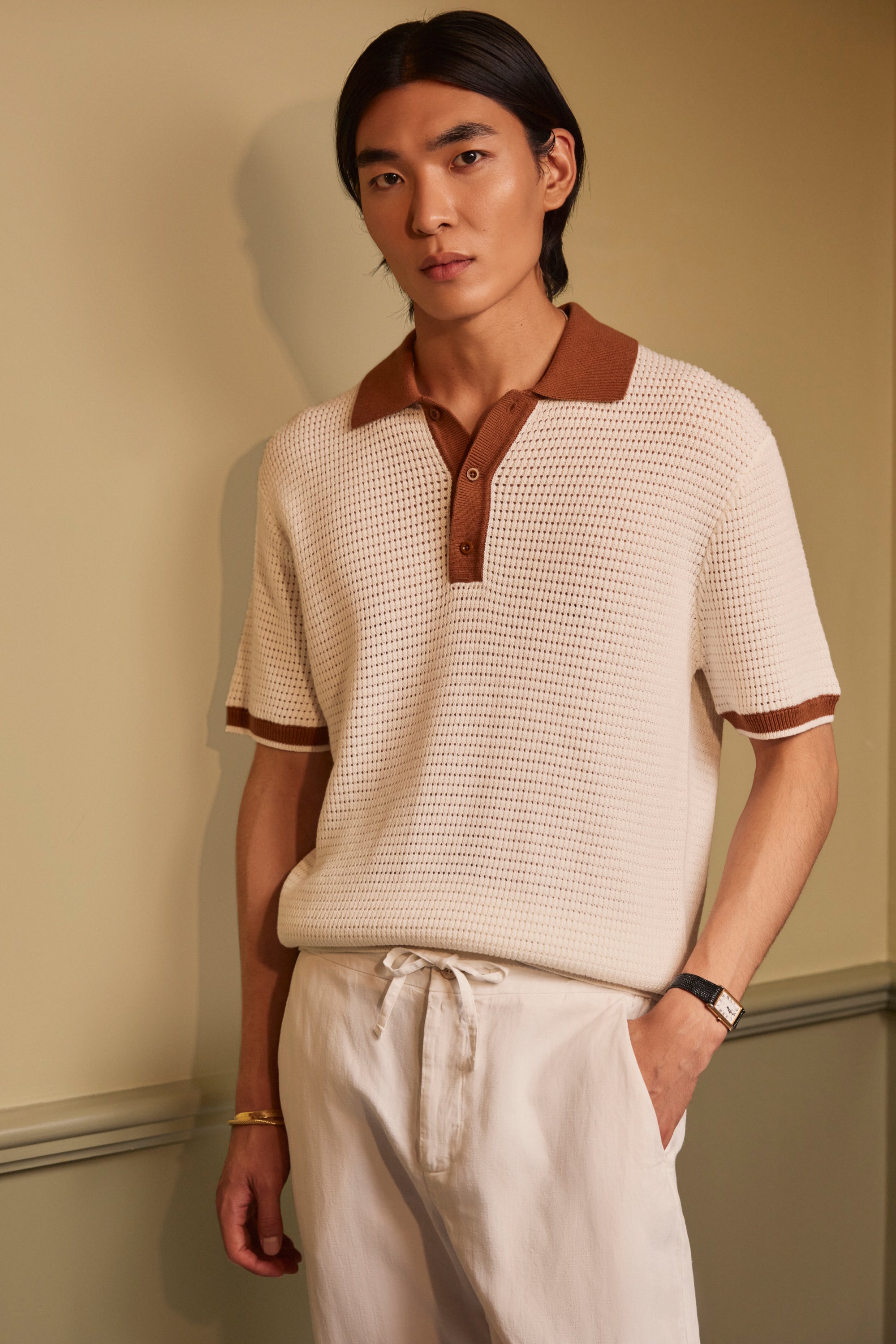 A crochet-inspired take on our Vidal polo, crafted in a pointelle knit with a looser gauge. Featuring a contrasting collar and hems, this transeasonal piece is designed to be worn solo or layered.