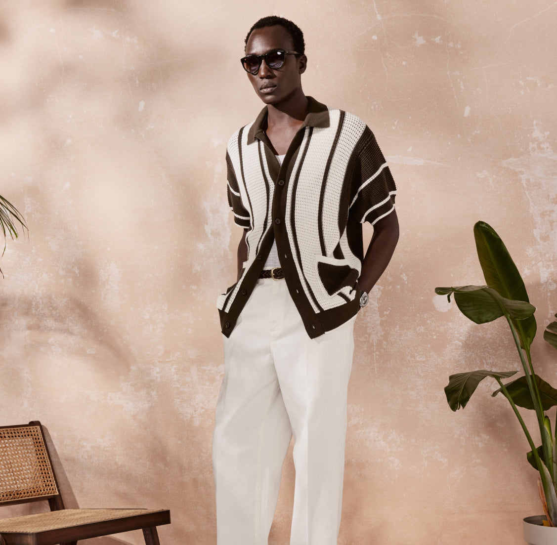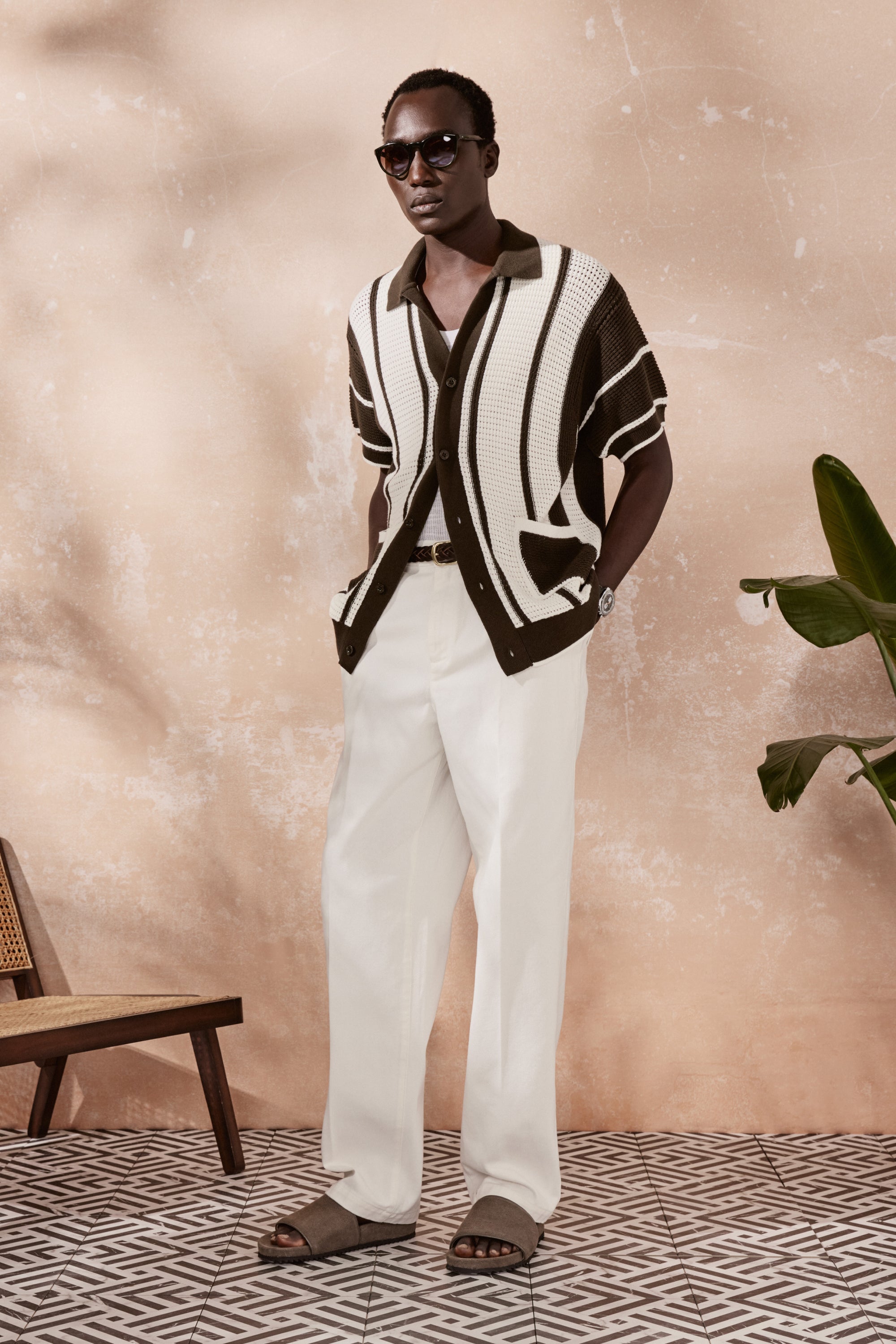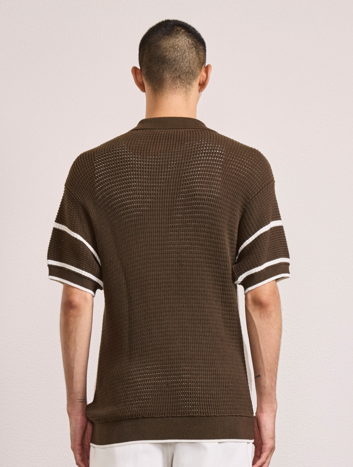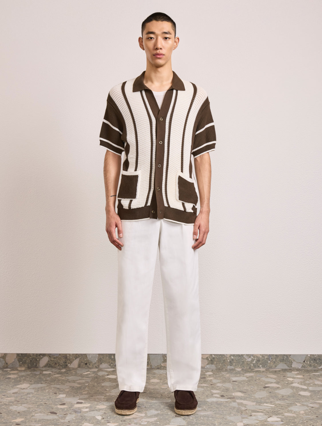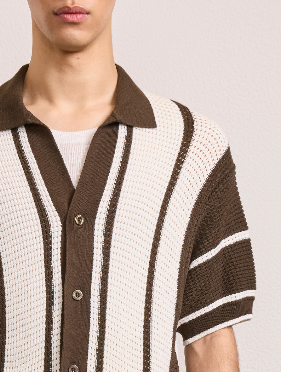 A staple of the season, Fabricio is our pointelle knit short-sleeve cardigan. Featuring a stripe pattern that pays homage to the linear designs of our eponymous frescobol bat. Crowned with an open collar for an air of casual elegance.