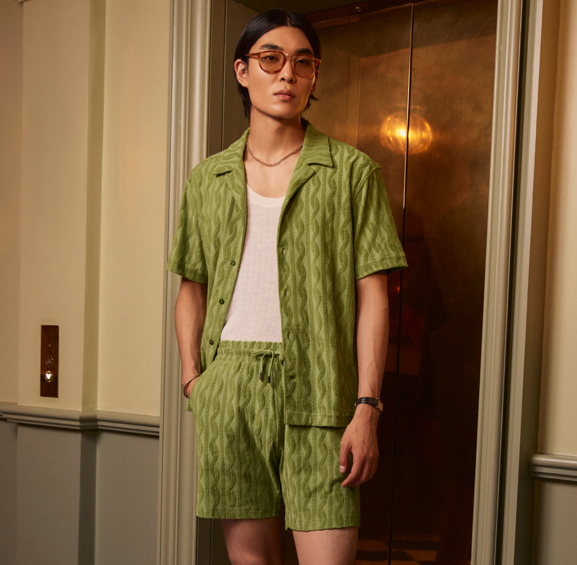 A FRESCOBOL take on warm-weather loungewear, our short-sleeved Roberto shirt is a lightweight organic terry cotton in an intricately crafted jacquard fabrication. Crowned with a camp collar and cut for a relaxed fit, pair with matching Augusto shorts for superior comfort.