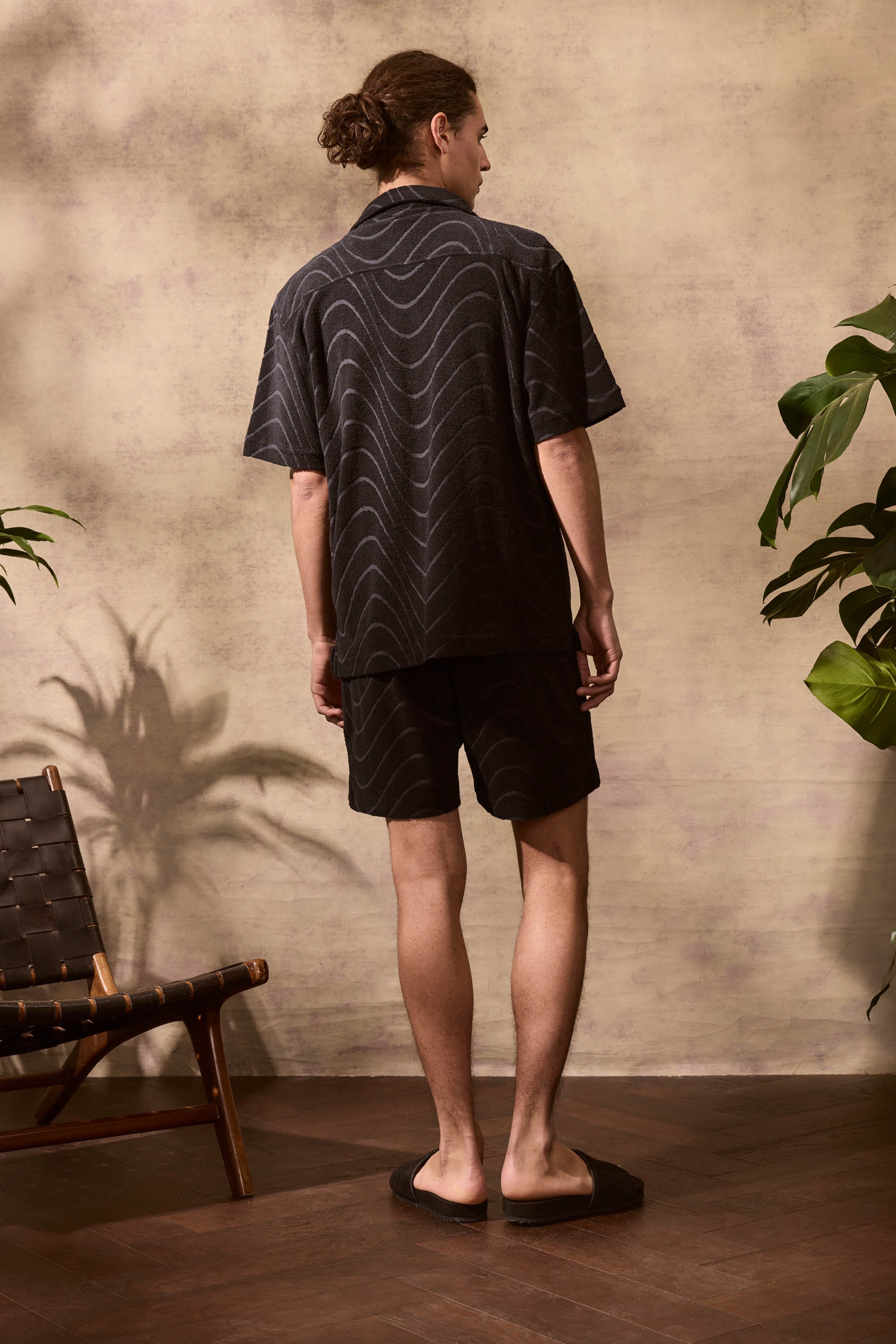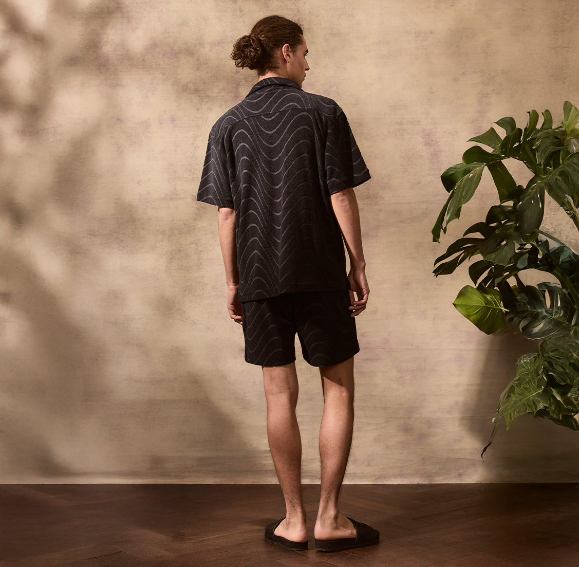 A contemporary take on warm-weather loungewear, our Augusto shorts are a lightweight organic terry cotton in a bespoke jacquard fabrication. Intricately crafted to feature the undulating waves of seasonal Fibra print, with an adjustable waist and relaxed drape. Pair with matching Roberto shirt for superior comfort.